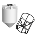 Для крупных объектов предлагаются конусные емкости объемом 10 000 литров и более, включая модели с турбинной или лопастной мешалкой в обрешетке. Такие резервуары комплектуются площадками обслуживания и рассчитаны на эксплуатацию в промышленных условиях.