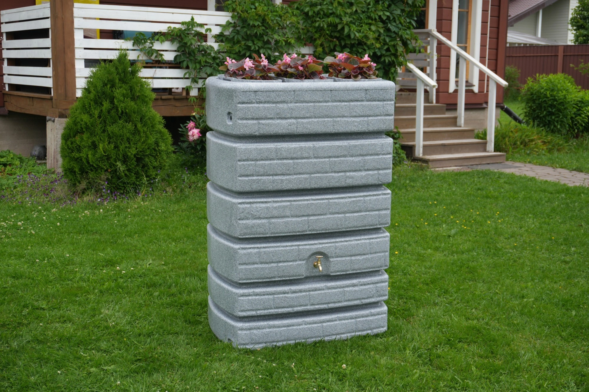На верхней части изделия установлены три кашпо объёмом 3 литра каждая, что позволяет украсить цветами или другими растениями экстерьер загородного участка.