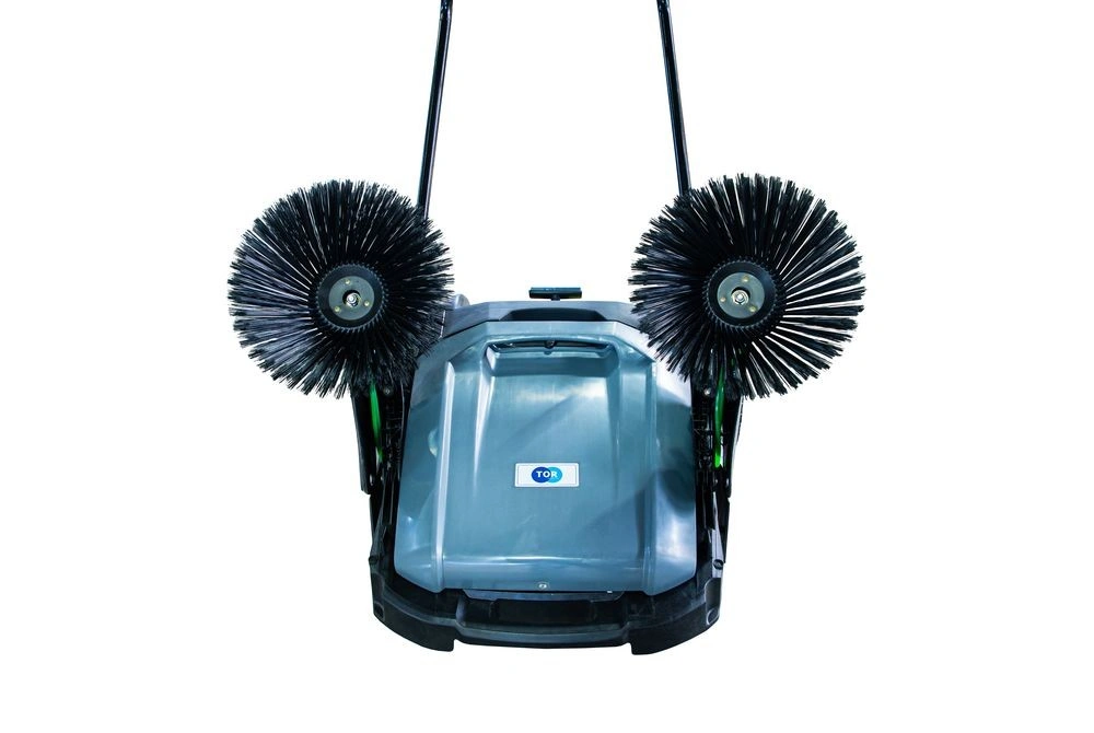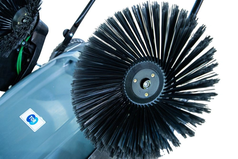 TOR M92 — надежная и производительная подметальная машина с механическим приводом, созданная для эффективной уборки больших площадей как внутри, так и снаружи помещений. Неприхотлива в обслуживании, проста в управлении и не требует электропитания — идеальна для заводов, складов, торговых центров, ферм и других объектов с интенсивным загрязнением. Ширина уборки 92 см, производительность до 2860 м²/час, вместительный контейнер на 55 литров и регулируемая скорость основной щетки обеспечивают высокую эффективность при минимальных усилиях оператора. Где используется? Подходит для уборки производственных цехов, складских помещений, торговых залов, ангаров, гаражей, ферм, парковок, дворовых территорий и других объектов с твердым покрытием. Эффективна как в закрытых помещениях, так и на открытых площадках — обеспечивает чистоту без использования электроэнергии или топлива. Основные преимущества: - Высокая производительность — до 2860 м²/час благодаря ширине уборки 92 см и мощной трехщеточной системе - Три щетки — две боковые убирают мусор вдоль стен и бордюров, основная щетка длиной 48 см собирает отходы в контейнер - Регулируемая скорость основной щетки — позволяет адаптировать работу под тип поверхности и уровень загрязнения - Вместительный контейнер — объем 55 литров снижает частоту опустошения при уборке больших площадей - Эргономичная рукоять — регулируется по высоте и углу наклона, складывается для удобного хранения и транспортировки - Удобство перемещения — складная конструкция и дополнительная ручка на корпусе позволяют легко перевозить машину в багажнике или на тележке - Надежность и долговечность — механический привод не требует технического обслуживания, устойчив к перегрузкам и работает в любых погодных условиях Комплектующие (при необходимости замены): — Набор боковых щеток 350 мм для подметальных машин M92 (2 шт) — артикул 1025549 — Основная щетка 480 мм для подметальных машин M92 — артикул 1025553