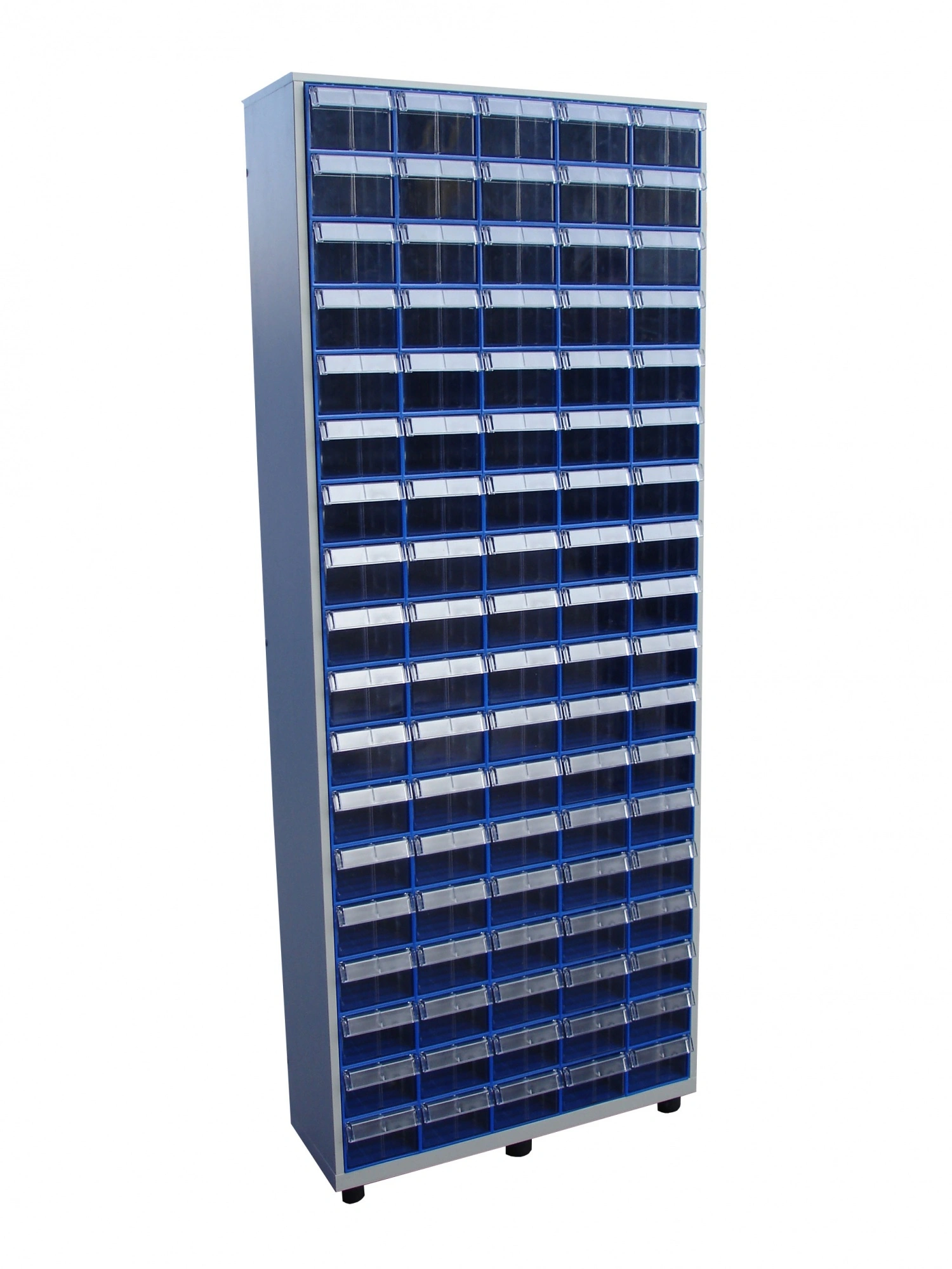 Шкаф в сборе Стелла-техник С-2-90 на 90 коробов (ЛДСП) отлично впишется в интерьер любого склада, подсобного или торгового и офисного помещения. Цвет ламинированного ДСП - серый. Цвет коробов С-2 синий, прозрачный. Главная особенность шкафа – объединение большого количества коробов с определенным типовым размером. Регулируемые ножки шкафа гарантируют устойчивость шкафа даже на неровных полах. Изделие допускает одновременное применение 90 пластиковых складских контейнеров. Прозрачные внутренние короба С-2 позволяют легко находить содержимое и контролировать полноту наполнения. Внутренний короб легко вынимается для опустошения или наполнения, по принципу спичечного коробка. Он имеет рельефную структуру днища и усиленные толстые стенки. За счет этого, изделие справляются с высокими эксплуатационными нагрузками. Внутренние полезные размеры выдвижного короба: 220х123х80мм. Возможность установки одной продольной перегородки (артикул: С-2 продольная) или до трех поперечных (артикул: С-2 поперечная). Продольная и поперечная перегородки одновременно не устанавливаются. Перегородки в комплект короба не входят и поставляются отдельно. Рекомендуемая нагрузка на короб, в составе шкафа, не более 3кг.