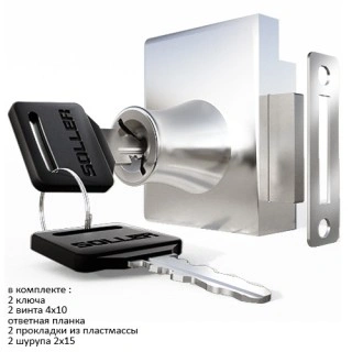 В комплекте : 2 ключа, ответная планка, 2 винта 4х10, 2 прокладки из пластмассы, 2 шурупа 2х15