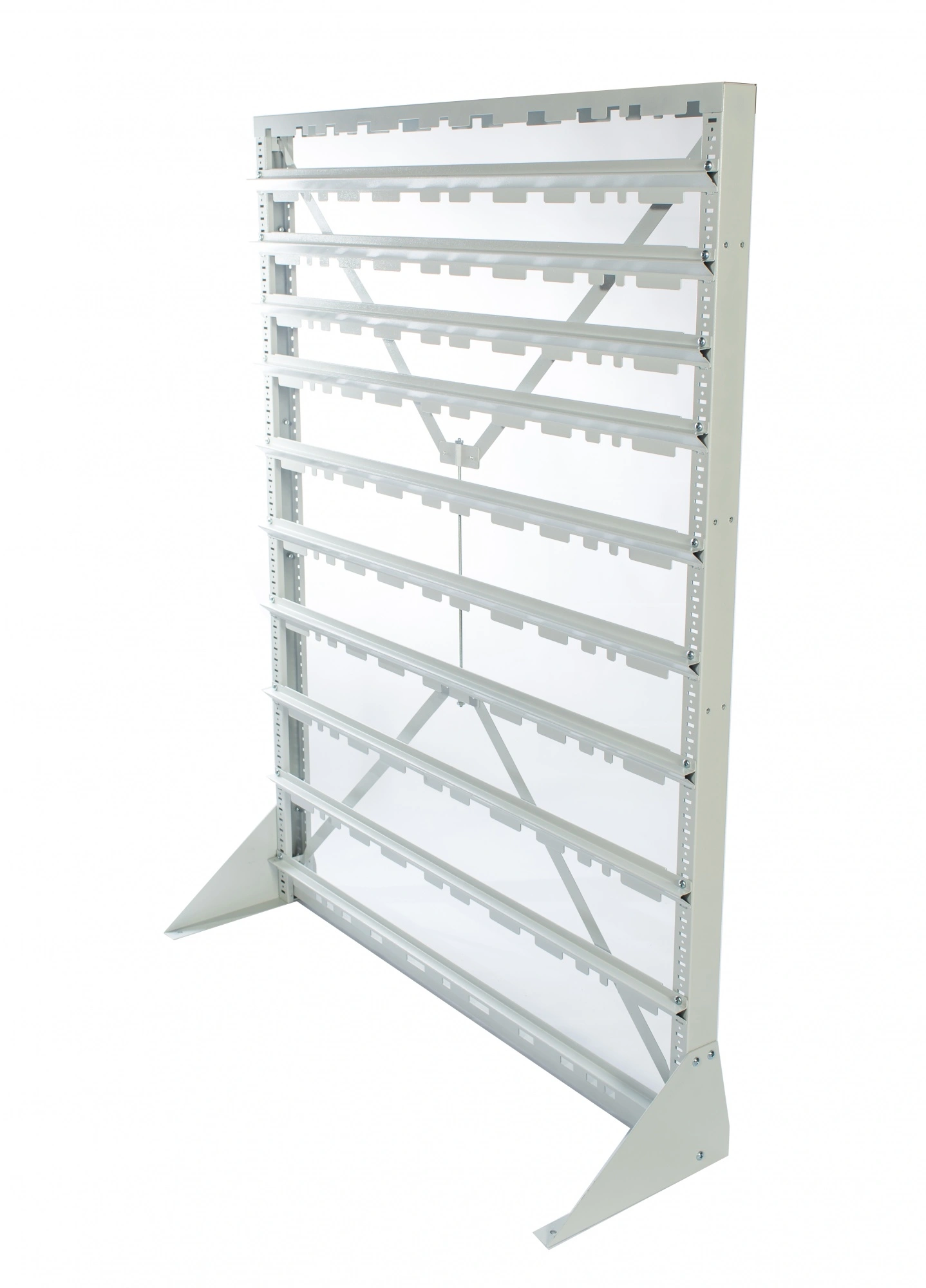 Стойка Стелла-техник V-1150х1515 без опоры, серия К, для пластиковых ящиков, состоит из металлической рамы, снабженной крестовиной-растяжкой для жесткости конструкции. На вертикальных стойках рамы имеются перфорационные отверстия для закрепления поперечных держателей. Держатели крепятся к раме с помощью саморезов. Высоту держателей можно изменять в зависимости от высоты закрепляемых пластиковых ящиков. В случае необходимости, стойка может закрепляться на передвижной платформе, специально предназначенной для этой цели. В комплект поставки входят: Вертикальная стойка перфорированная 2 шт.; Верхняя планка-опора 1 шт.; Полукрестовина для стяжки стойки 2 шт.; Шпилька резьбовая диаметр 8мм. для стяжки полукрестовин 1 шт.; Гайка М8 для шпильки резьбовой 2 шт.; Шайба М8 для шпильки резьбовой 2 шт.; Саморезы диаметр 6мм. на 1 держатель 2 шт.