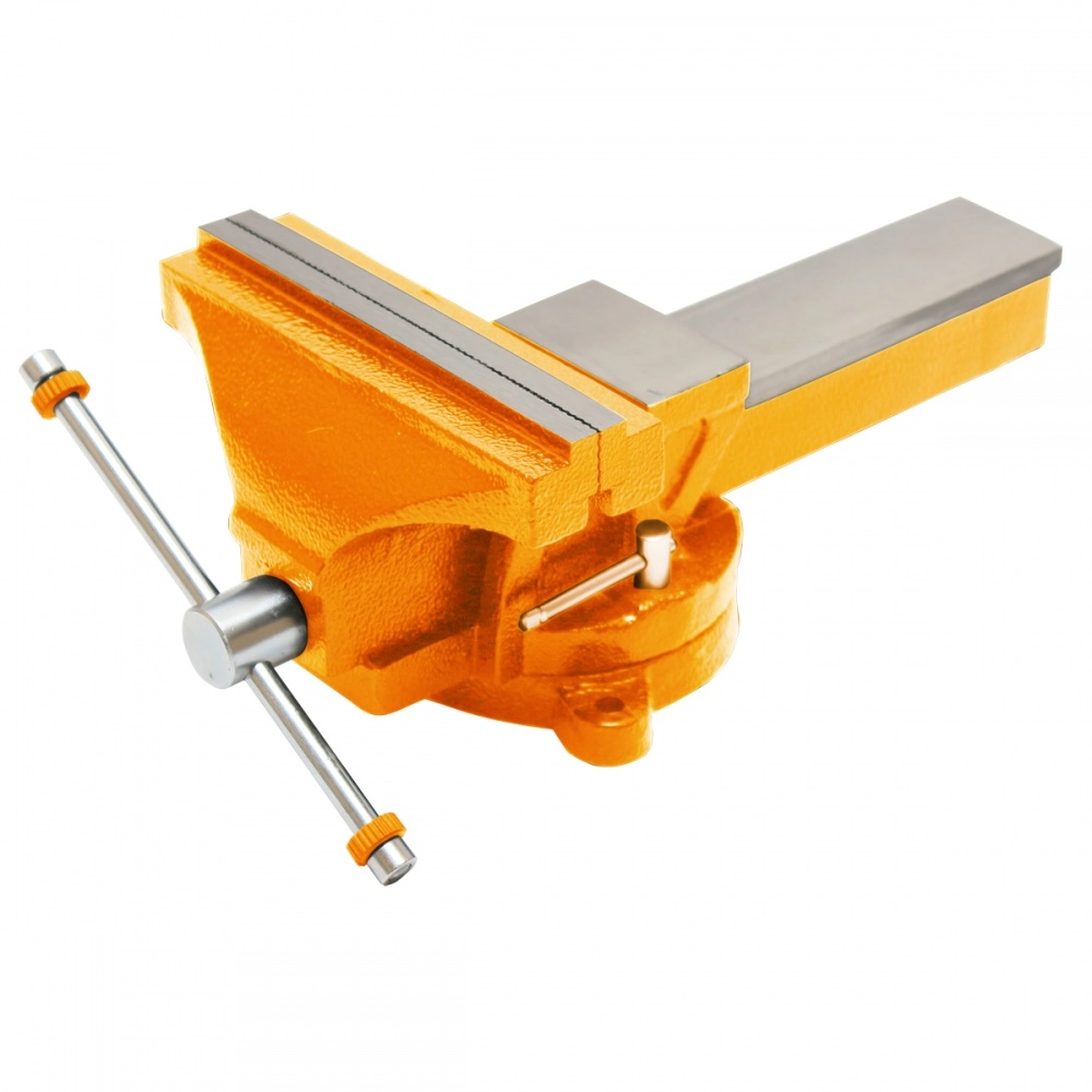 Массивный чугунный корпус и основание покрыты краской, защищающей тиски от коррозии, что увеличивает их рабочий ресурс. Сменные зажимные губки выполнены из закалённой стали высокого качества. Корпус, с возможностью поворота на 360° относительно основания, способствует удобной обработке заготовки. Наличие наковальни расширяет функциональные возможности слесарных тисков. Предусмотрено крепление основания к верстаку (рабочему столу) 3-я болтами.