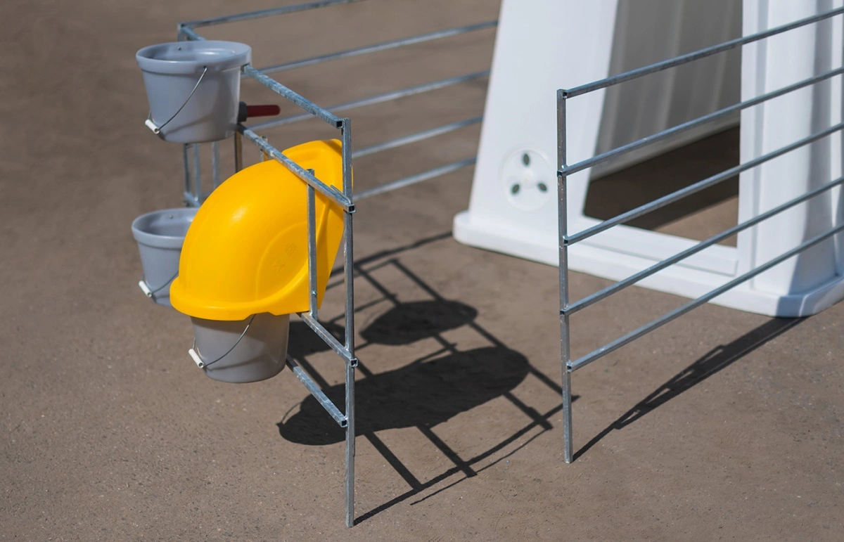 Рекомендуем для эксплуатации с индивидуальным большим домиком для телят, фермерскими ведрами для воды и корма, защитным колпаком, ведром для выпойки и пологом.