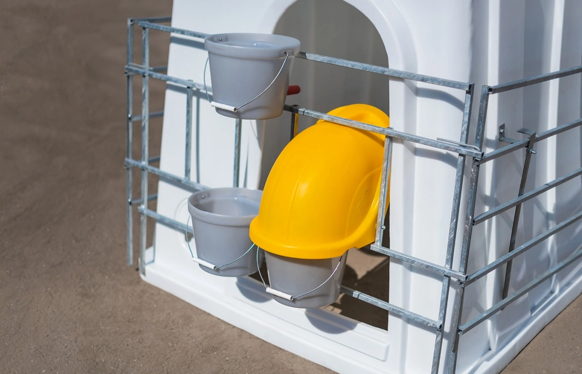 Конструкция вольеров позволяет организовать питание телят в различных климатических зонах. При закрытии теленка в доме ведерки для молока, воды и корма размещаются на передней стенке напротив дверного проема. Для развития опорно-двигательной системы животного, ведерки разносятся на различное расстояние и могут быть закреплены в любом месте.